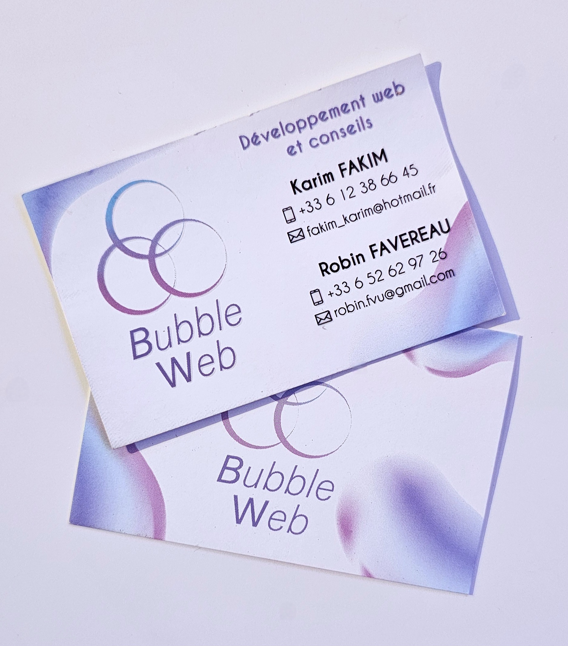 Carte de visite pour une jeune entreprise de développement de sites Web sous le nom de Bubble Web, en recto-verso et imprimée. J'ai créé la charte graphique en déclinant les résultats sur plusieurs supports : carte de visite, logo et vidéo.