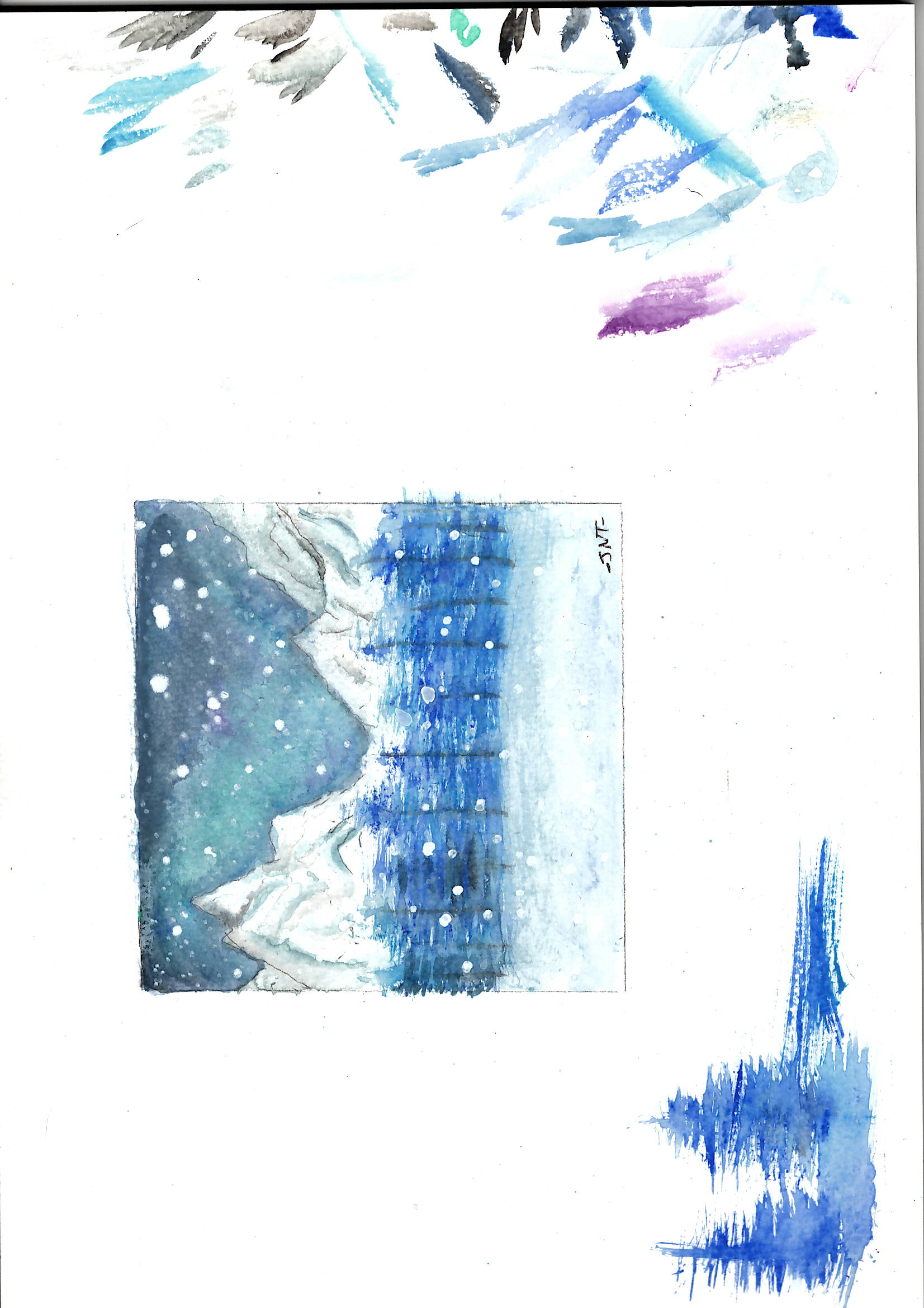 Peinture à l'aquarelle d'un paysage montagneux enneigé.