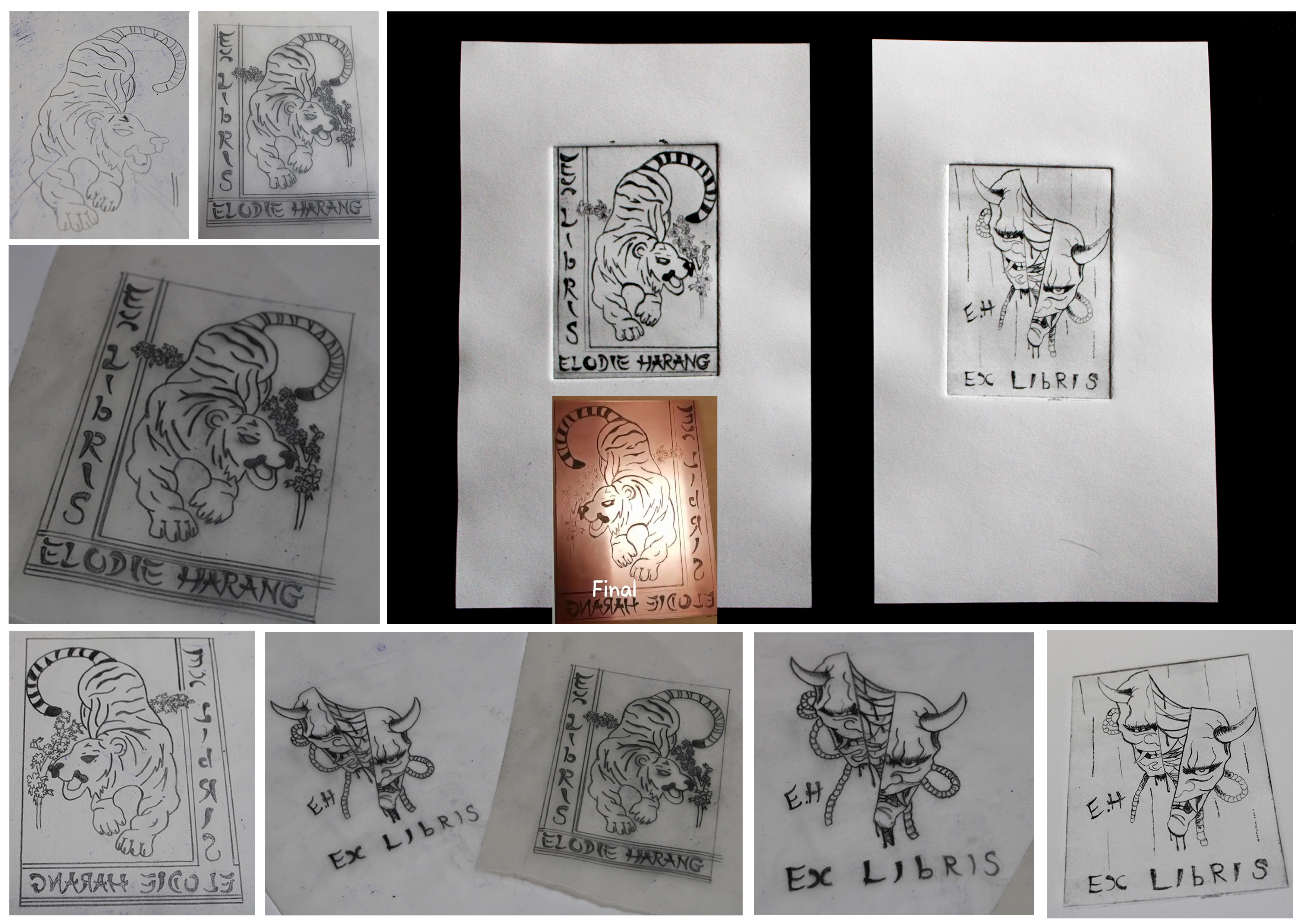 Différents tirages d'Ex-libris sur plaque de cuivre gravée, puis imprimés à la presse.